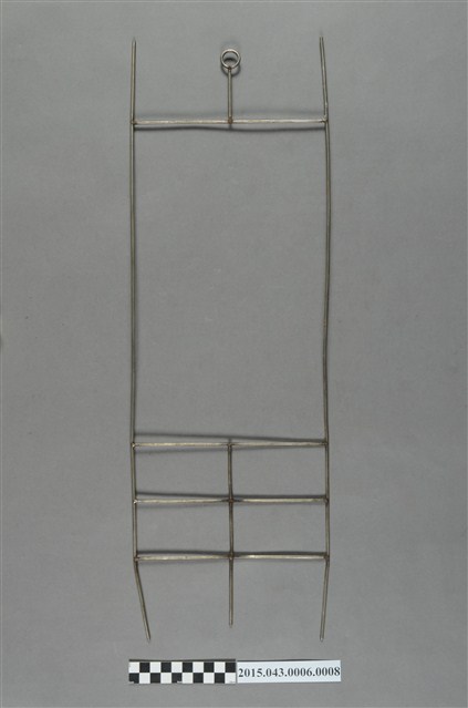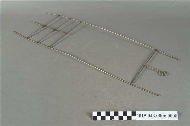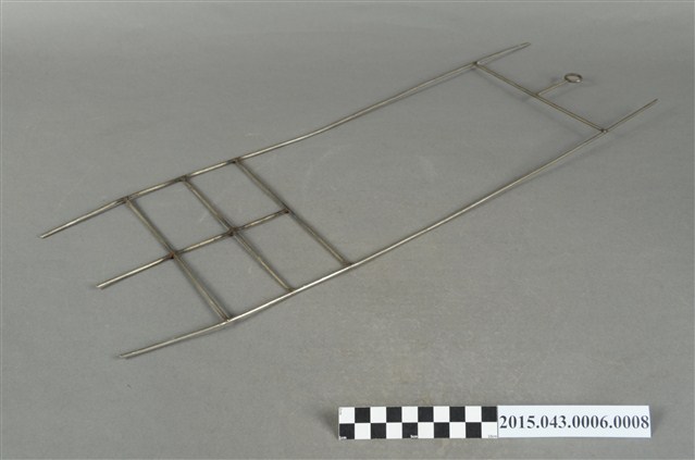長型底片吊掛架,不銹鋼材質,頂部有一圓圈形提把,上半部區域鏤空,可用來吊掛較大片之底片,近底部為四方格網狀,可用來吊掛小片底片。