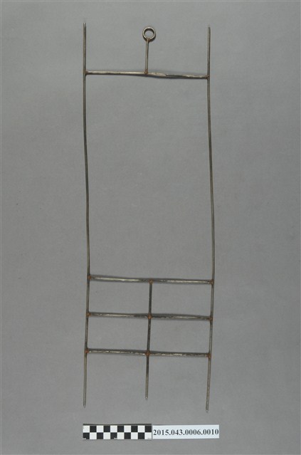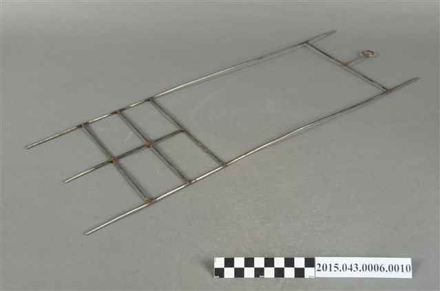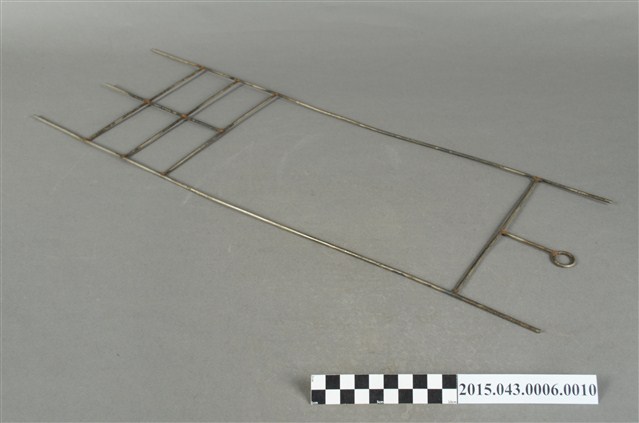 長型底片吊掛架,不銹鋼材質,頂部有一圓圈形提把,上半部區域鏤空,可用來吊掛較大片之底片,近底部為四方格網狀,可用來吊掛小片底片,鋼架中段略有歪斜變形現象。