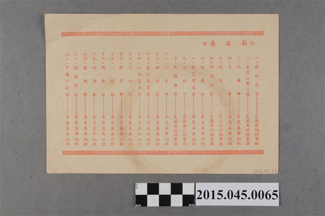 入場卷上方印有「永懷領袖紀念總統蔣公九秩誕辰民族舞蹈晚會」,下方印有「時間:中華民國六十五年十月二十九日晚上七時卅分」,「地點:高雄縣團管區後備軍人聯誼中心」,「主辦單位:高雄縣團管區司令部、鳳山市民眾服務分社」,「演出:李惠美舞蹈社、茱莉舞蹈補習班」,左右兩旁印有「實踐總統蔣公遺訓、完成反共復國大業」。入場卷背面印有節目表,李惠美舞蹈社演出舞名:祝壽舞、弓舞、打連廂、霓裳羽衣舞、小蜜蜂、回娘家、春江花月夜、山地豐年舞、思相記、筷子舞、一枝梅、捕魚舞、雨傘舞、傜族舞、擦乾眼淚、中國一定強,茱莉舞蹈補習班演出舞名:蔣山長青、家在山那一邊、俏佳人、羽扇迎春、小放牛、天倫舞影。