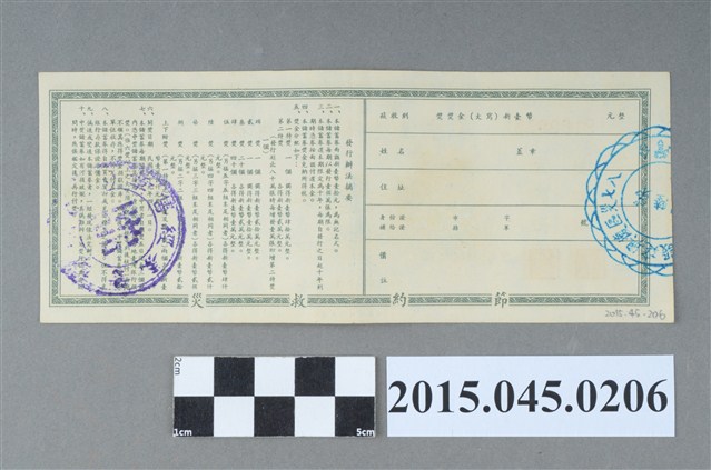 八七災區復興建設有獎儲蓄券(第陸期) 1959年8月7日起連續數日,臺灣苗栗以南至高雄地區,出現60年來前所未見的狂風暴雨,以致整個中南部陷入嚴重的水患中,災情慘重,鐵公路全面癱瘓,災民多達數十萬人,此自然災害被稱為「八七水災」,而此儲蓄券則是政府為了籌措重建災區經費。