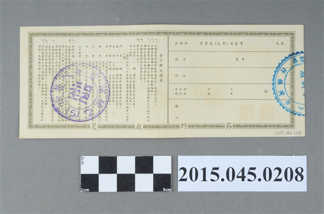 八七災區復興建設有獎儲蓄券(第捌期) 1959年8月7日起連續數日,臺灣苗栗以南至高雄地區,出現60年來前所未見的狂風暴雨,以致整個中南部陷入嚴重的水患中,災情慘重,鐵公路全面癱瘓,災民多達數十萬人,此自然災害被稱為「八七水災」,而此儲蓄券則是政府為了籌措重建災區經費。