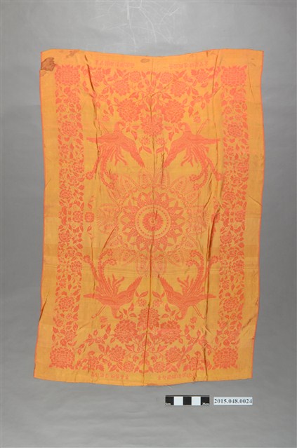 本件喜幛為紅色與金色紗線織成之雙色緹花布,材質光滑,推測為絲質,共有4件相同喜幛。喜幛正面為正紅底色搭配金色圖紋,正中央為一萬壽菊,外層環繞菊花葉與小菊花,上下環繞鳳凰與牡丹紋,象徵祝賀新人長命百歲、富貴吉祥。布料上下邊皆有「興泰絲織廠出品」、「金雙龍織造廠出品」等金色緹花字。喜幛背面則與正面顏色相反,為金色底紅色字紋。