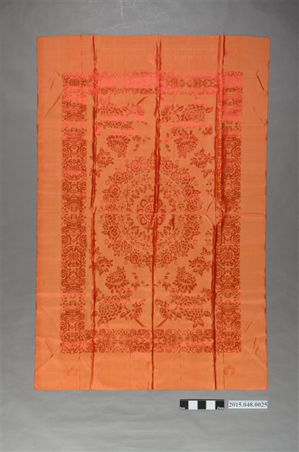 本件喜幛為紅色與金色紗線織成之雙色緹花布,材質光滑,推測為絲質,共有4件相同喜幛。喜幛正面為正紅底色搭配金色圖紋,正中央為一萬壽菊,外層環繞菊花葉與小菊花,上下環繞鳳凰與牡丹紋,象徵祝賀新人長命百歲、富貴吉祥。布料上下邊皆有「興泰絲織廠出品」、「金雙龍織造廠出品」等金色緹花字。喜幛背面則與正面顏色相反,為金色底紅色字紋。