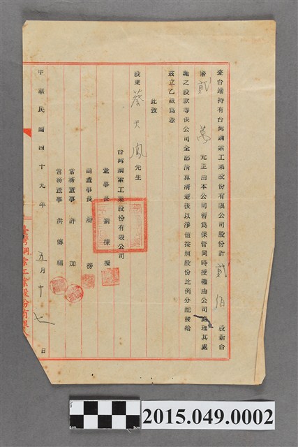 2015.049.0002 臺灣鋼索工業股份有限公司發給蔡天凰清算股份分配證明書