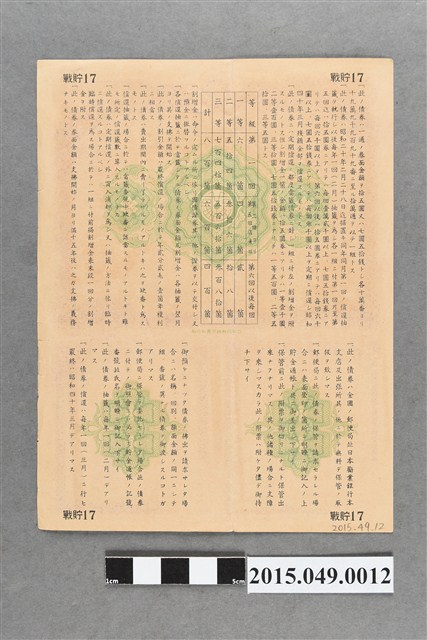 本件為日本勸業銀行1944年10月發行的戰時儲蓄債券,原價15圓,10圓賣出,償還時15圓。整理編號為597,債券下方還有證券保管券及證券保管求請書。背面有詳細使用規範。