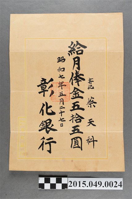 2015.049.0024 彰化銀行給蔡天科薪資單
