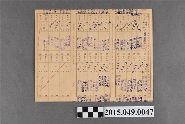 保險院簡易保險局發給黃氏碧玉保險費領收簿。證書編號為養台44424號,保費為一圓。有從1932年8月1日至1934年11月10日的繳費記錄。