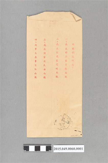 任職臺灣省立高雄女子中學校長的薛佩琦給任職新台灣農業機械公司副理的蔡天凰信封,背面有反共抗俄標語如同胞們我們要:一、為反對共匪麥國而戰,二、為反抗俄匪侵略而戰,為救國家救民族而戰,四為爭生存爭自由而戰。