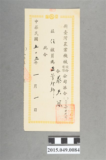 2015.049.0084 蔡天凰新臺灣農業機械股份有限公司派令