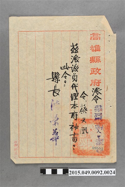 2015.049.0092.0024 高雄縣政府派蔡天凰為秘書派令
