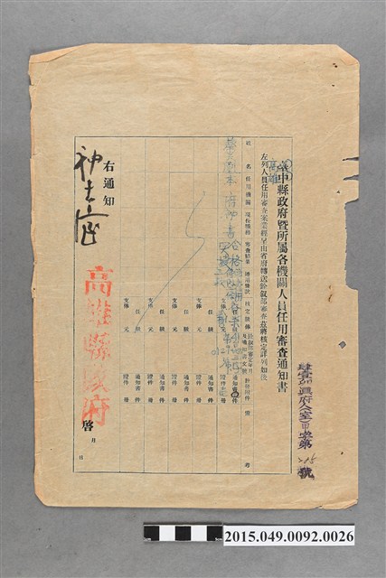 2015.049.0092.0026 高雄縣政府給蔡天凰高雄縣政府暨所屬各機關人員任用審查通知書