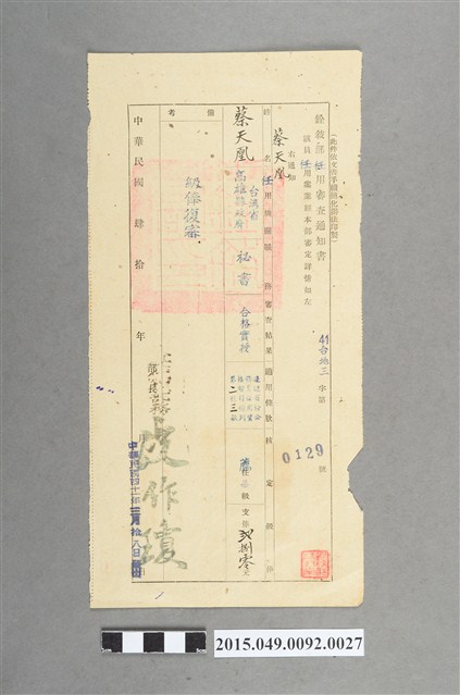 2015.049.0092.0027 蔡天凰銓敘部任用審查通知書