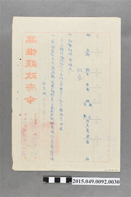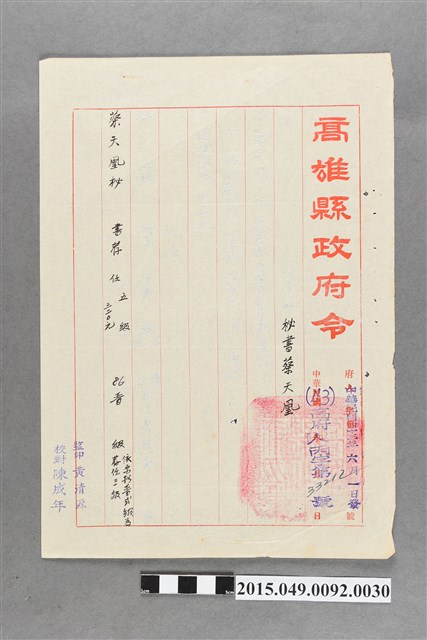 2015.049.0092.0030 高雄縣政府給蔡天凰考績結果令