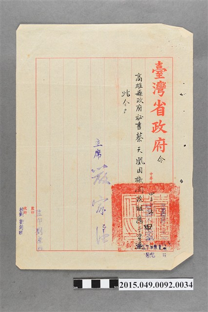 2015.049.0092.0034 臺灣省政府因機關改組資遣高雄縣政府秘書蔡天凰令