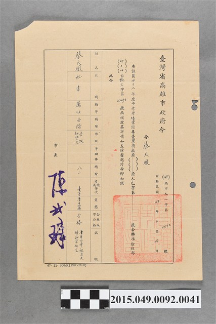 2015.049.0092.0041 臺灣省高雄市政府蔡天凰48年度考績結果令