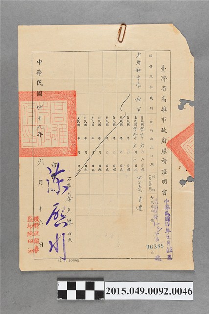 2015.049.0092.0046 蔡天凰臺灣省高雄市政府服務證明書