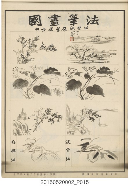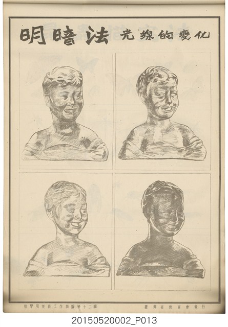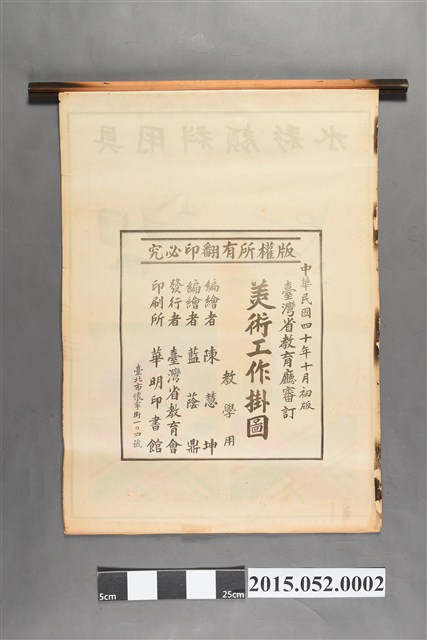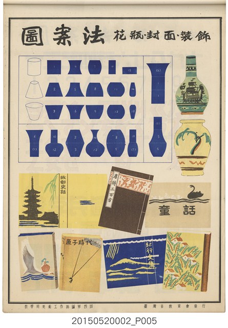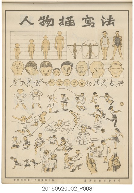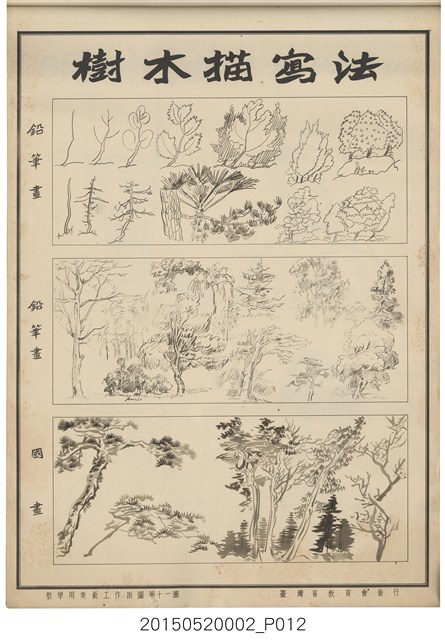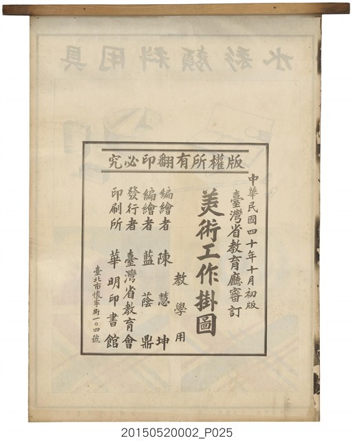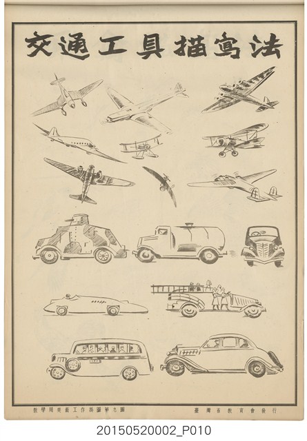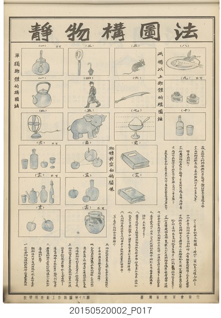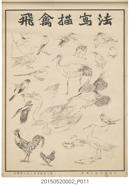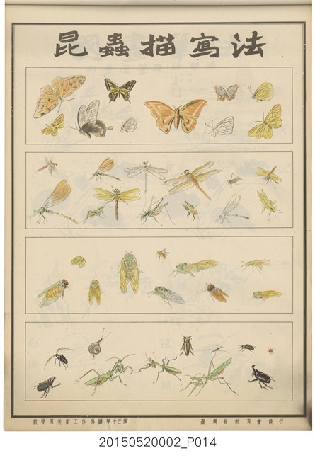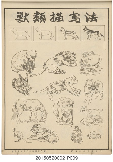 封面註明「臺灣省教育廳審訂」、「教學用美術工作掛圖」、「藍蔭鼎、陳慧坤編繪」、「臺灣省教育會發行」。一組24頁,民國40年10月初版。除封面外共計23張各動物類別繪圖。藍蔭鼎為臺灣知名水彩畫家,隨石川欽一郎習畫有成,作品曾入選帝展。陳慧坤畢業自東京美術學校,長期任教於臺灣省立師範學院(今臺師大)。