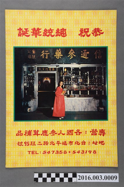 總統著唐裝於屋外玻璃前攝影/廣告-信通参藥行 恭祝 總統華誕/廣告-大同公司恭祝 總統華誕/總統與夫人於戶外合影/蔣總統─世界反共的萬里長城/總統演說,總統揮帽而夫人在其左側/廣告-信託投資公司 恭祝 總統華誕/廣告-裕隆汽車股份有限公司 以不斷研究與發展的成果─恭祝 總統華誕