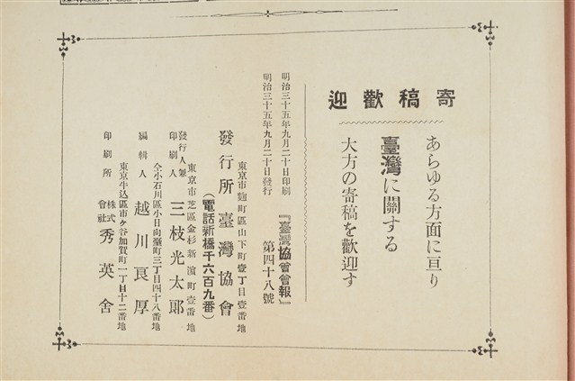 「臺灣協會」成立於1898年4月,其所成立之目的為組織一個有規模的「殖民研究」團體,並隨即於1898年10月發行機關刊物 《台灣協會會報》。本期內容有,論說/新加坡的政治機關/續台灣的衛生/台灣茶的前途/產業/馬尼刺に於ける葉卷菸草製造的概況/台灣食鹽專賣/雜錄/台灣統治的現狀/台灣に於ける創業時代的教育/檳榔/台灣案內/雜報/台灣經濟界的近勢/台灣內地間的商取引與台灣に於ける卷菸草的狀況/台灣金年的米作/台灣經濟界的信用/昨年度的台灣歲入/昨年度三專賣業收入/清國的樟山/先月的台灣貿易/台灣貿易的進步/