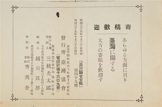 《臺灣協會會報》第49號明治35年10月20日