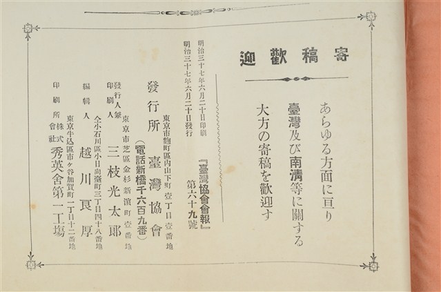「臺灣協會」成立於1898年4月,其所成立之目的為組織一個有規模的「殖民研究」團體,並隨即於1898年10月發行機關刊物 《台灣協會會報》。論說/臺灣警察談 圖師庄一郎/アルゼり─に於けろ土人教育 森校三/臺灣及對岸の地理 石井八万次郎/產業/臺灣の糖業卑見 鈴木藤三郎/臺灣製糖業の現在及將來 下斗米半治/戰爭と淡水貿易の關係/雜錄/對岸事情/臺灣の風俗 高橋真/林本源一家の由來/臺灣の神?/臺灣の離緣狀 谷脇虎之助/雜報/臺灣財政獨立/幣政改革/大租權整理/即決例實施狀況/廳長民事調停/鐵