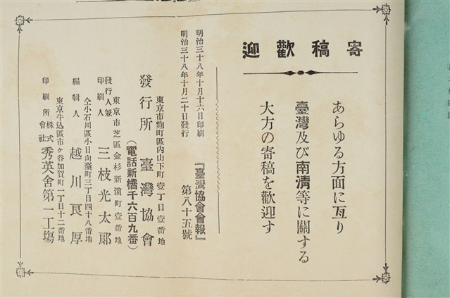 「臺灣協會」成立於1898年4月,其所成立之目的為組織一個有規模的「殖民研究」團體,並隨即於1898年10月發行機關刊物 《台灣協會會報》。本期內容有,論說/戰時歐米漫遊雜感 鹿子木小五郎/產業/宜蘭廳經濟事情 臺灣支部/鳳山廳下產業狀况 仝上/雜錄/舊政府時代の理蕃 伊能嘉矩/雜報/臺灣蕃界橫斷の成功/臺灣隘勇線の前進/臺灣經濟界の前途/臺灣歲入の增加/臺灣の增加/臺灣の烟草專賣事業/臺灣製糖會社の作業成績/臺北廳模範田の成績/律令と臺灣/臺灣の戶口調查/臺灣蕃地取締規則制定/臺灣蕃害と季節との關係/