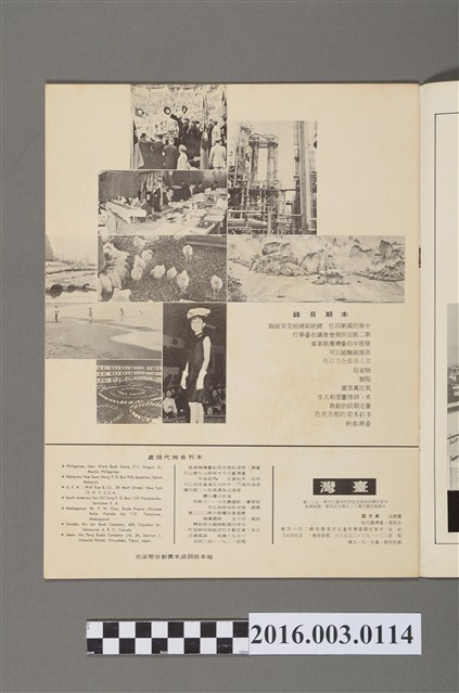 《臺灣》畫刊是臺灣省政府新聞處出版的刊物,以圖文並茂的內容傳達臺灣省的省政資訊、生活型態及與省民習習相關的實用資訊。臺灣畫刊社出版《臺灣》民國55年6月目錄/中華民國第四任總統副總統宣誓就職/第二屆亞洲商會會議在臺舉行/發展中的臺灣養雞事業/長江萬里圖/水、詩情畫意和人生