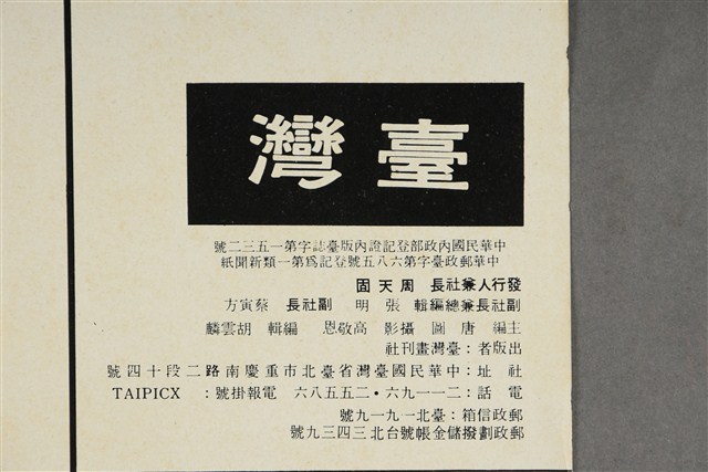 《臺灣》畫刊是臺灣省政府新聞處出版的刊物,以圖文並茂的內容傳達臺灣省的省政資訊、生活型態及與省民習習相關的實用資訊。臺灣畫刊社出版《臺灣》民國57年9月目錄/每月新聞剪輯/紅葉棒球隊成功史/發揚中華文化紀念孔子誔辰/我國教育史上劃時代的改革/曾文水庫/心長集/西湖高級工商職校在發展中/黃主席巡視王功海埔地開發工程/中興紙業公司/復盛工業股份有限公司/臺灣航業蒸蒸日上/基隆港務局/新業化工廠股份有限公司/如意洗衣粉是理想的清潔劑