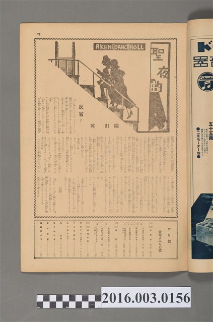 臺日グラフ是由台灣日日新報在1930年10月1日刊行,主要是以文學作品、文物描述介紹臺日文化內涵,此期刊目前在台灣典藏狀況,以台灣歷史博物館最為完整。本號內容有,本期目次/連載小說 聖夜曲 織田英(一九)/實話よみもの 尖端女人風景 夢野寬(二四);婦人鬪士の半生 S・K記者(二六);ある私娼の告白 M‧N記者(二七);巡查にはなつたけれど 豐島舜吉(二八)/實話小說 相剋 小島泰介(三二)/漫畫 街に落ちてねる話 野村幸一(二三);首斬りが上手 同人(二九);ミツキーマウスと プルート(三O)/映畫物語