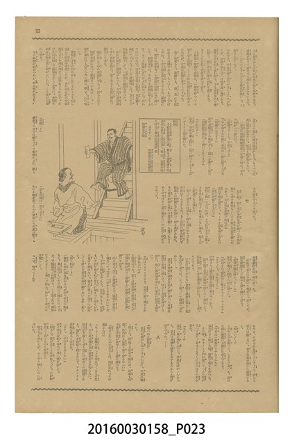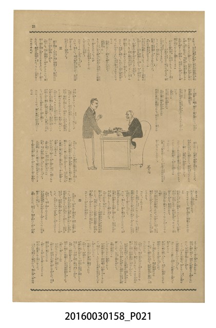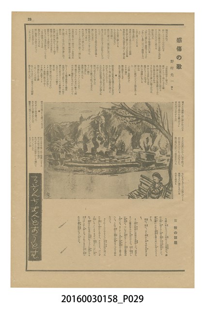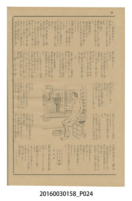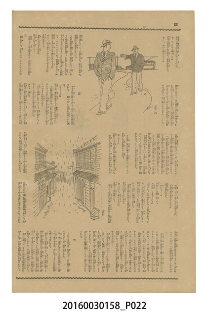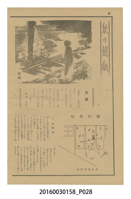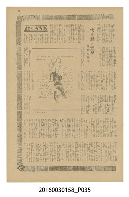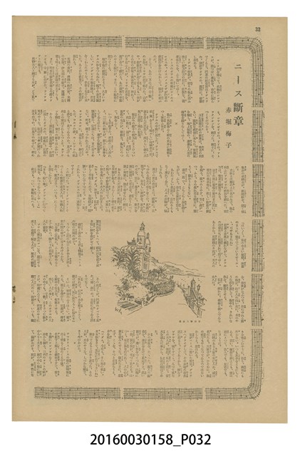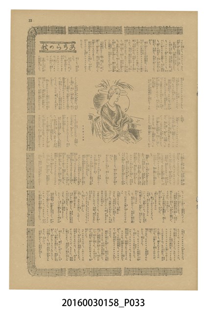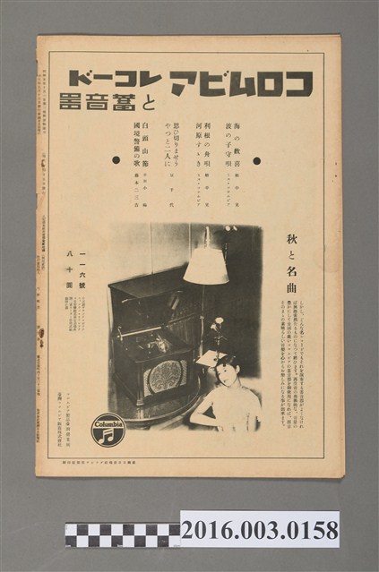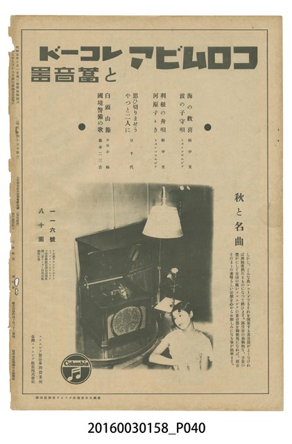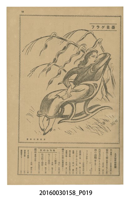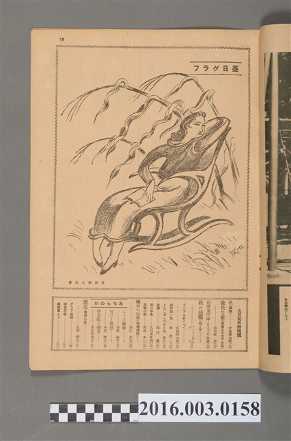 臺日グラフ是由台灣日日新報在1930年10月1日刊行,主要是以文學作品、文物描述介紹臺日文化內涵,此期刊目前在台灣典藏狀況,以台灣歷史博物館最為完整。本號內容有本期目次/秋(扉繪)宮田彌太郎(一九)/愉快な輩(長篇ユウモア小說)美乃村史(二O)/秋の感觸(繪ど文)アルカン同人合作(二六)/ランプをあぐつて宮田彌太郎/緩徐調一色 林鹿二(二六)/まんじゆしやげ 小島泰介(二七)/夜霧 西川滿(二八)/秋の手帳 北川原幸明(二八)/感傷の歌 野村幸一(二九)/續水の世界(科學漫談) 羽仁定平(三O)/あちらの