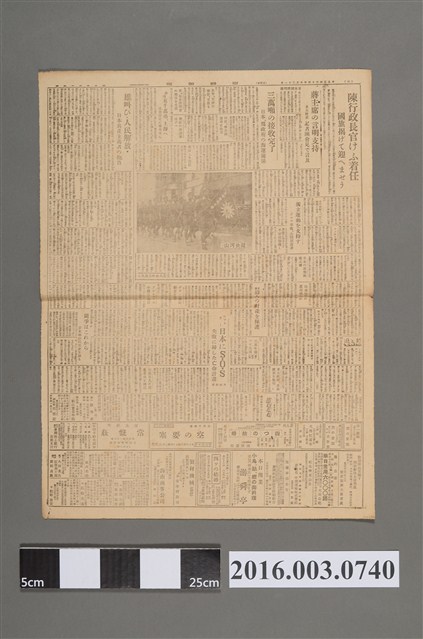 民國34年10月21日《臺灣新報》頭版新聞內容大致為,陳儀長官蒞臺而廣播電臺開始中央轉播,並舉辦三民主義鐵道青年團大會,還有慶祝台灣光復相關活動,要求開始說國語且認為應該廢止天皇制度,對於極東諮問委員會蘇聯拒絕派代表參加,而國際聯合機構將開總會。