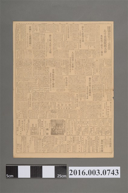 昭和20年10月24日《臺灣新報》第一版新聞內容大致為,陳儀蒞臺為參與明天所舉行之光復典禮,舉國歡慶入夜後更點燈祭祖報告台灣光復之事,且日本天皇有可能因此事而退位,國民黨對於實施三民主義的機構希望省民入黨幫助,目前山東省已接收,財閥也信行改組。