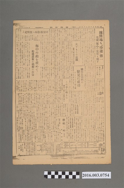 昭和20年7月7日《台灣新報》頭版新聞內容大致為,我國守備軍隊隨時待命出軍加入此激烈的戰役,許多中小城市的生產及交通網絡都可能遭受破壞,而南端的沖繩戰米軍損失了四萬五千之多,現在台北及新竹更被列為下波攻擊要目,各地方緊急召開會議。