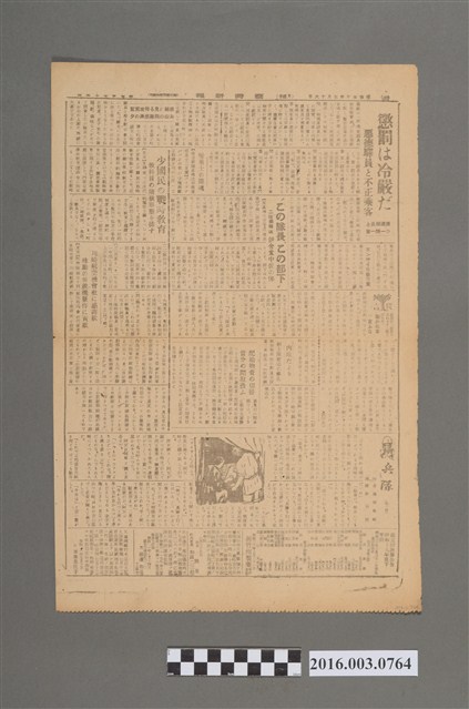 昭和20年7月16日《台灣新報》頭版新聞內容大致為,敵軍對我國各地進行攻擊,戰況相當激烈,傷亡人數也不斷升高,對於我國在此戰役中身亡的軍官們表達哀弔與驕傲,而戰功彪炳的將士也頒予勳章以示榮耀。