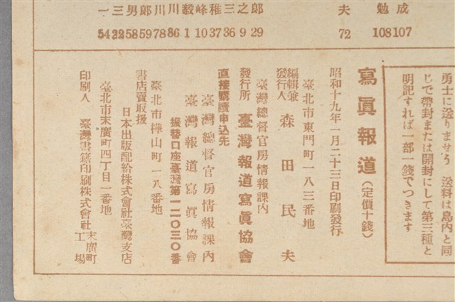 1.此物件為昭和19年1月23日發行的《寫真報道》,由臺灣總督府情報課編輯,編輯及發行人為森田民夫,由臺灣報導寫真協會發行,內容主要利用大量的相片紀錄當時日本與各國的戰爭紀錄及臺灣本島之事,再輔以文字加以說明,例如此次刊物內容有陸軍少年飛行兵學校報導、陸軍工兵學校報導、海軍潛水學校報導、前線飛行機與船艦之情況、……等。