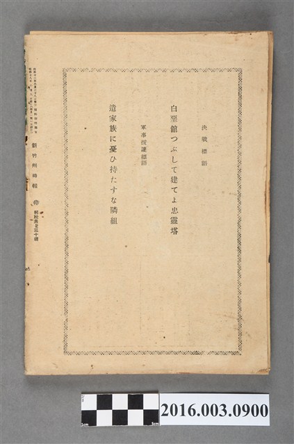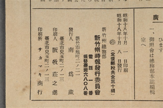 1.此物件為《新竹州時報》之十月號,發行於昭和18年(1943)10月8日,編輯兼發行人南為藏,發行單位為新竹州總務部內新竹州時報發行委員會,此次內容有「昭和19年台灣海軍志願兵徵募要項」、「日本臣民最高之榮譽」、「臺灣一家建設論」、「皇民奉公運動」、「決死奉公之秋」……等。