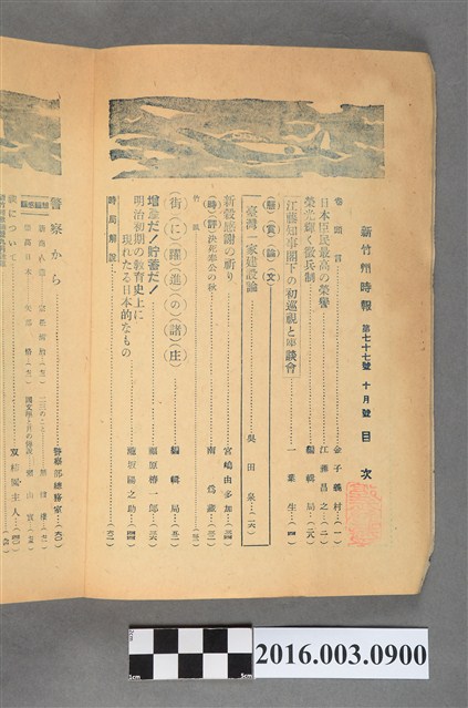 2. 《新竹州時報》於昭和12年(1937)6月創刊,刊物形式為月刊,每月一冊,直至昭和18年(1943)12月,內容報導涵蓋現今桃竹苗地區之產業、文化、衛生、民生等各個面向的議題,但此刊物創刊時間與中日戰爭爆發時間相當接近,遂內容