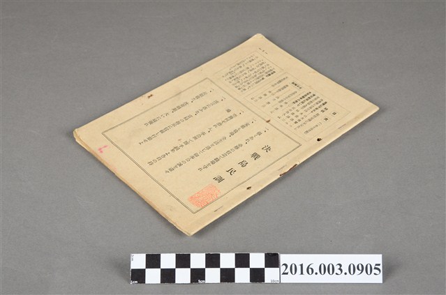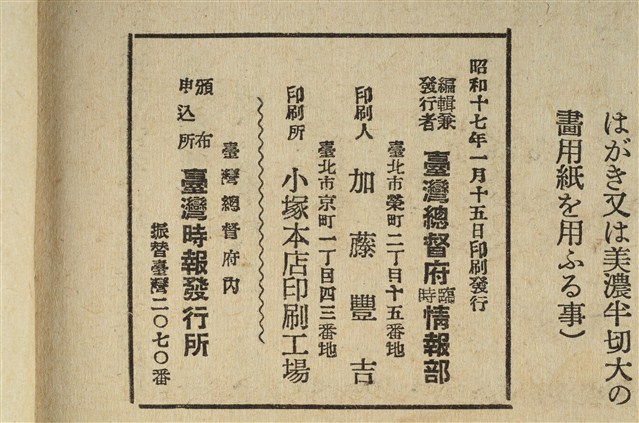1.此物件為《決戰島民訓》,於昭和17年1月15日發行,編輯兼發行為臺灣總督府臨時情報部,此刊主要是報導二戰時臺灣內部情形與前線戰爭狀況,封面有五點島民訓,此次內容有「食糧に不安なし」、「冷凍庫には魚の山」、「青果の配給も萬全」、「增產對策に就いて」、「大東亞戰爭の持移」、「法令解說」、「大東亞戰爭日誌」,各則文章除文字書寫外,尚搭配照片與插圖,可透過圖文清楚了解當時之情況。2.中日戰爭爆發後,總督府成立「臨時情報委員會」,專門處理各種情報及政令宣傳,後又改組成「臨時情報部」,隸屬總督府官房,專門掌管與
