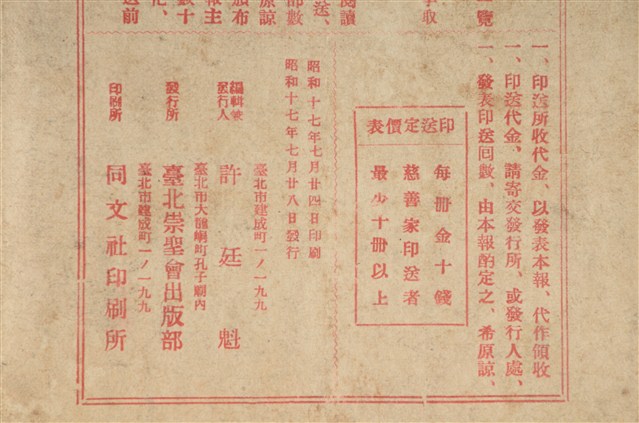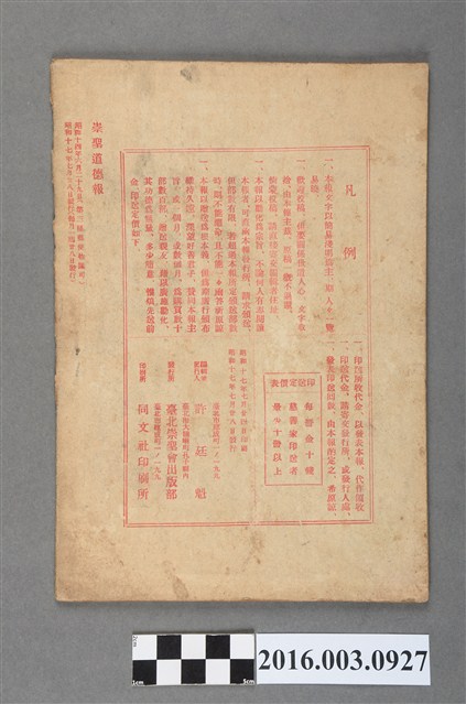 1.此物件為《崇聖道德報》月刊第41號,於昭和17年(1942)7月28日發行,編輯兼發行人為許廷魁,發行所為臺北崇聖會出版部,此刊以講述道德、儒學為主,例如此次內容便有:「說智」、「何謂道」、「止於至善」、「報應錄」、「舉會喧雜非敬神之道」、「孝女紅蓮棄兒捨得」、「殺人償命欠債還錢」…….等內容。
