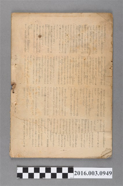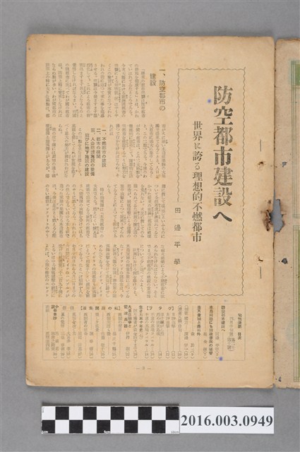 1.此物件為《台新》旬刊第二年第十號,為四月中旬號,此物件出版頁未存,出版時間與出版人不詳,但時間可推測應於昭和20年(1945)4月10日發行,發行所為臺灣新報社,此刊內容主要以戰爭時事報導為主,此次內容有「防空都市建設へ」、「奉天會戰と森鷗外」」、「大東亞戰爭と電波兵器」、「私之疎開生活」……等篇章。