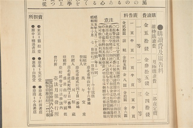 昭和5年10月7日出版的《台法月報》第24卷第10號內容大致有,文化刑法における教育刑の意義/情況の變更に因る假差押命令取消の申立權者に就て彙報/法令/辭令/統計/臺法俳壇/臺法月報質疑用紙/質疑應答/受贈書目/判例/判例研究]等。《台法月報》於明治38年6月發行,至明治39年11月共發行了17冊,爾後更名為《法院院報》,發行44冊,在明治44年又再度恢復《台法月報》之名,至昭和18年共發行443冊。《台法月報》主要為記錄當時法令的頒布動態外,也有法院判決例,且每冊有時人所寫的雜報、雜錄、訴訟叢談,可反