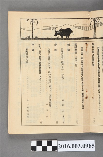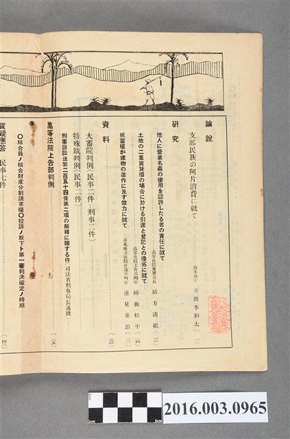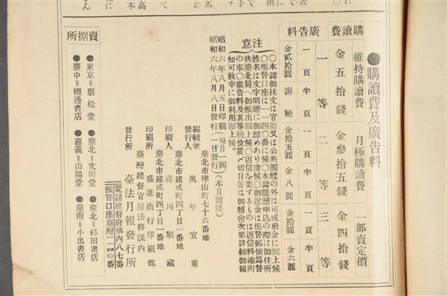 昭和6年4月6日出版的《台法月報》第25卷第8號內容大致包括,支那民族の阿片消費に就て/他人に營業名義の使用を認許した者の責任に就て/土地の二重賃貸借の場合に於ける引渡と登記との優劣に就て/抵當權がけ建物の造作に及ぼす效力に就て/大審院判例/特殊裁判例/高等法院上告部判例/臺法月報質疑用紙/質疑應答/統計/文苑等。《台法月報》於明治38年6月發行,至明治39年11月共發行了17冊,爾後更名為《法院院報》,發行44冊,在明治44年又再度恢復《台法月報》之名,至昭和18年共發行443冊。《台法月報》主要為記