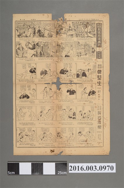 此份文物為1950年10月12日的《中央日報漫畫半週刊》第51號,上方用簡易漫畫表達世界情勢,下方則是長連載的〈拍案驚奇—尼姑公憤〉。