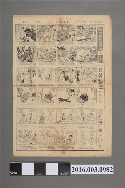 此份文物為1950年11月23日的《中央日報漫畫半週刊》第9版,上方為時事漫畫:〈可惜美麗的臉孔,從此掌上了不可消除的瘡疤了!〉等;新聞人物:〈陳納德〉等;下方則是長連載的〈拍案驚奇—蘇聯割禾機〉。