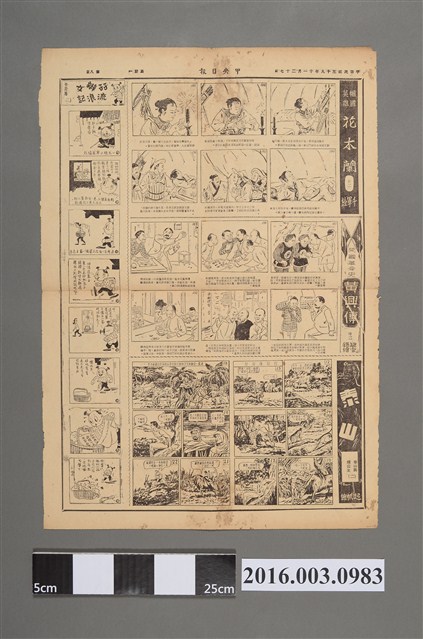 此份文物為1950年11月27日的《中央日報漫畫半週刊》,上方為時事漫畫:〈他的宿酒還沒有醒〉等;下方則是長連載的〈土包子下江南—風聲鶴唳〉。