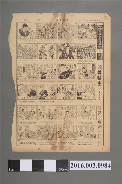 此份文物為1950年11月30日的《中央日報漫畫半週刊》,上方為時事漫畫:〈印度能得到甚麼〉等與新聞雜錦。下方則是長連載的〈拍案驚奇—草包縣長〉。