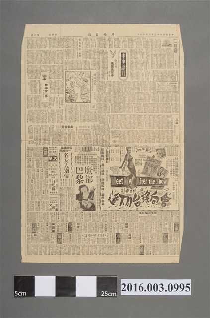 此份文物為1953年6月18日第五、六版的《中央日報》,內容主要為受讀者歡迎的「中副」(中央副刊),多為文學作品,除有名家手筆外,也可以看到其餘知名度不高的優秀作品。下方除了有電影宣傳外,還有招生、徵求、招尋、遺失、廉讓等資訊。