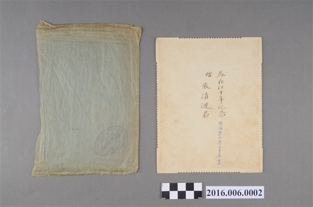 1. 本張照片影像為日本時代葫蘆墩公學校之第二任校長三田愛藏之半身肖像照,蓄鬍,著文官帽服。照片貼附於一厚紙板上,影像下方有「臺灣臺中 泉寫真館謹寫 Thotographer」之褐色標籤。紙板背面書以黑、藍雙色筆書寫「為在任十年紀念 贈 張清漣君 明治四十二年三月卒業」等字。本件另附淡綠色油紙封套一枚,封套上蓋有「TAICHIU, TAIWAN 泉寫真館 電話七一番 SHASHINKAN, IGUMI」紫藍色橢圓形戳印。