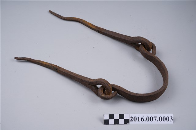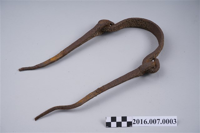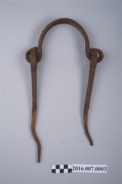 1.本件門閂鐵件,原位於善化陳宅第二落正身中央板門邊框內面上部,作為門板內面橫門閂插入固定使用,以鎖住大門,加強防禦。門閂為卡在門板後的橫木。一般門板內面通常有上下二根平行的門閂,善化陳宅即為典型。本件外型如拉環狀,以半圓形拉環加上二根針腳等三件鐵件組合而成,相當厚實,針腳呈四角型,長達27公分,推估原製作時可能長達1尺(30公分),可以釘入厚門框或木柱內。於104年10月由吳永義先生拆解取得。