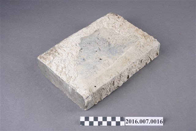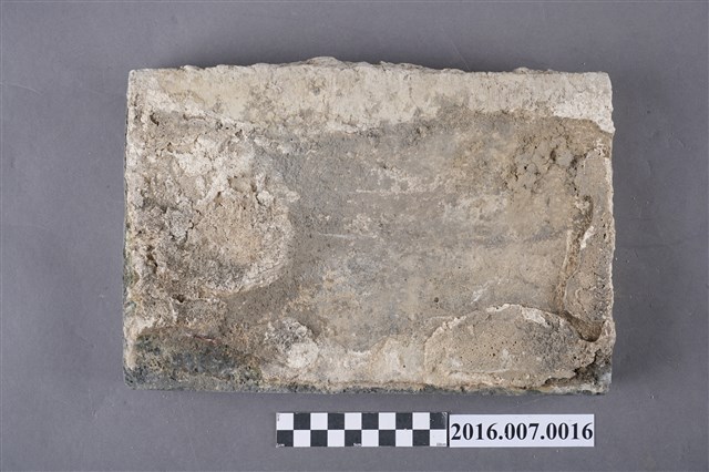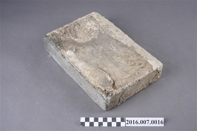 1.本件烏磚,為青灰色甓磚,原位於善化陳宅第二落步口廊臺基邊緣的砛墘,於104年11月12日拆解取得。尺寸為27X18X5公分,較一般條磚大,以直立條狀組砌,作為高落差臺階的地坪,左右寬面留有灰泥。烏磚係以還原法燒製,與紅磚以氧化法燒製不同,磚色呈青灰色,在臺灣傳統民居多作為點綴,較少大量使用,推測本件可能為來自中國大陸的建材。目前烏磚因還原法技術失傳,臺灣已無法生產。